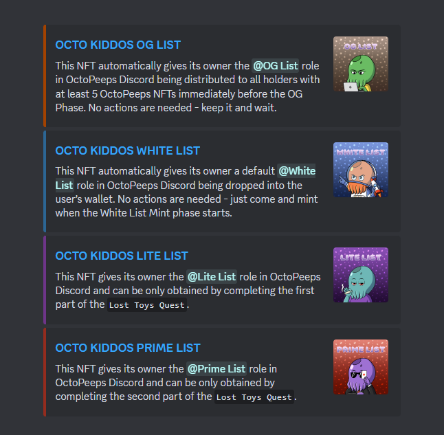 To sort users in all WL tires easily we will be sending them the corresponding NFTs. Don't forget to pass the holder verification in **OctoPeeps &#x20;**<mark style="background-color:yellow;">**# ✅┊nft-verify**</mark>  Discord channel to get the corresponding [WL role](https://whitepaper.octopeeps.com/lost-toys-quest/how-to-mint) automatically.
